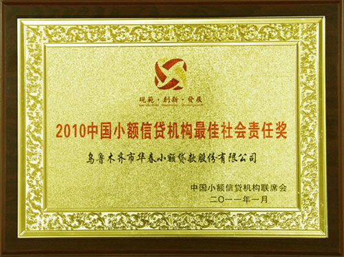 中國首屆小貸優(yōu)秀機(jī)構(gòu)評選揭曉——華春小貸榮獲“2010中國小額信貸機(jī)構(gòu)競爭力100強(qiáng)”、“2010中國小額信貸機(jī)構(gòu)最佳社會(huì)責(zé)任獎(jiǎng)”