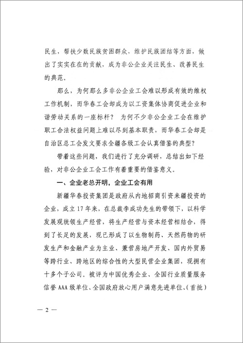 近日,自治區黨委政研室對新疆華春投資集團工會委員會的典型成功經驗進行了深入調研,發了題為《發揮非公有制企業工會作用的成功經驗值得推廣》的專報。結論是:新疆華春工會的實踐證明,非公企業工會有干不完的工作,不是可有可無,而是大有可為!這是在自治區黨委這個層面上,首次對全疆非公有制企業工會的肯定。
