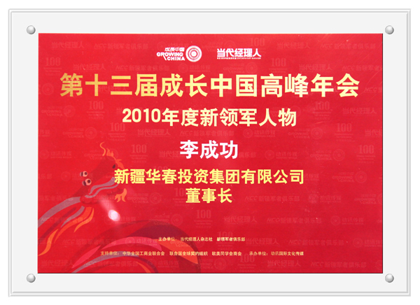 由《當代經理人》雜志社和新領軍者俱樂部主辦、全國工商聯、歐美同學會商會、聯合國全球契約組織等聯合協辦的第十三屆成長中國高峰年會暨2010中國成長百強頒獎盛典,于12月4日~5日在北京隆重舉行,新疆華春投資集團入選“2010中國成長百強”前25名、董事長兼總裁李成功先生榮獲“2010年度新領軍人物”稱號。