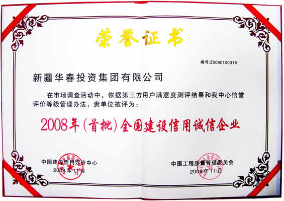“2008年首批全國建設信用誠信企業”榮譽證書